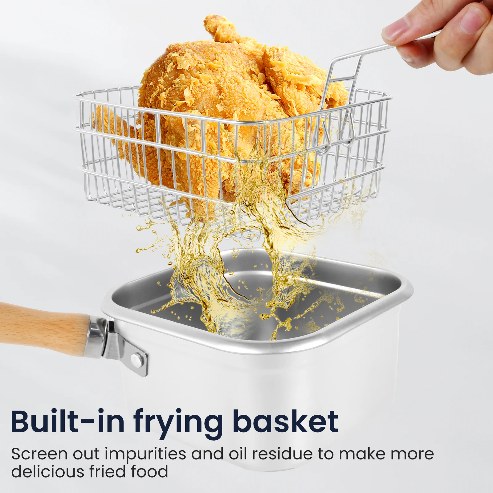 Quality Stainless Steel and Wood: This deep fryer is constructed of quality stainless steel, has good heat preservation, is sturdy, and long lasting. The handle uses quality wood, preventing it from heat and slippingSaving Oil: This frying pot can hold up to 4500ml of oil for even heating, deep enough to prevent oil splashing, wide enough, great for portion controlWide Use: This deep fryer pot is not only a frying pan, used to make fried chicken, French fries, kebabs, or Japanese cuisine, it can also be used as a steaming potEasy to Carry: This fryer pot is lightweight and compact, it can easily fit into a small bag, convenient to carry anywhere at any timeConvenient Design: Take off the wood handle and put on the lid, this oil fryer pot becomes a food saver, you can easily save the leftover food