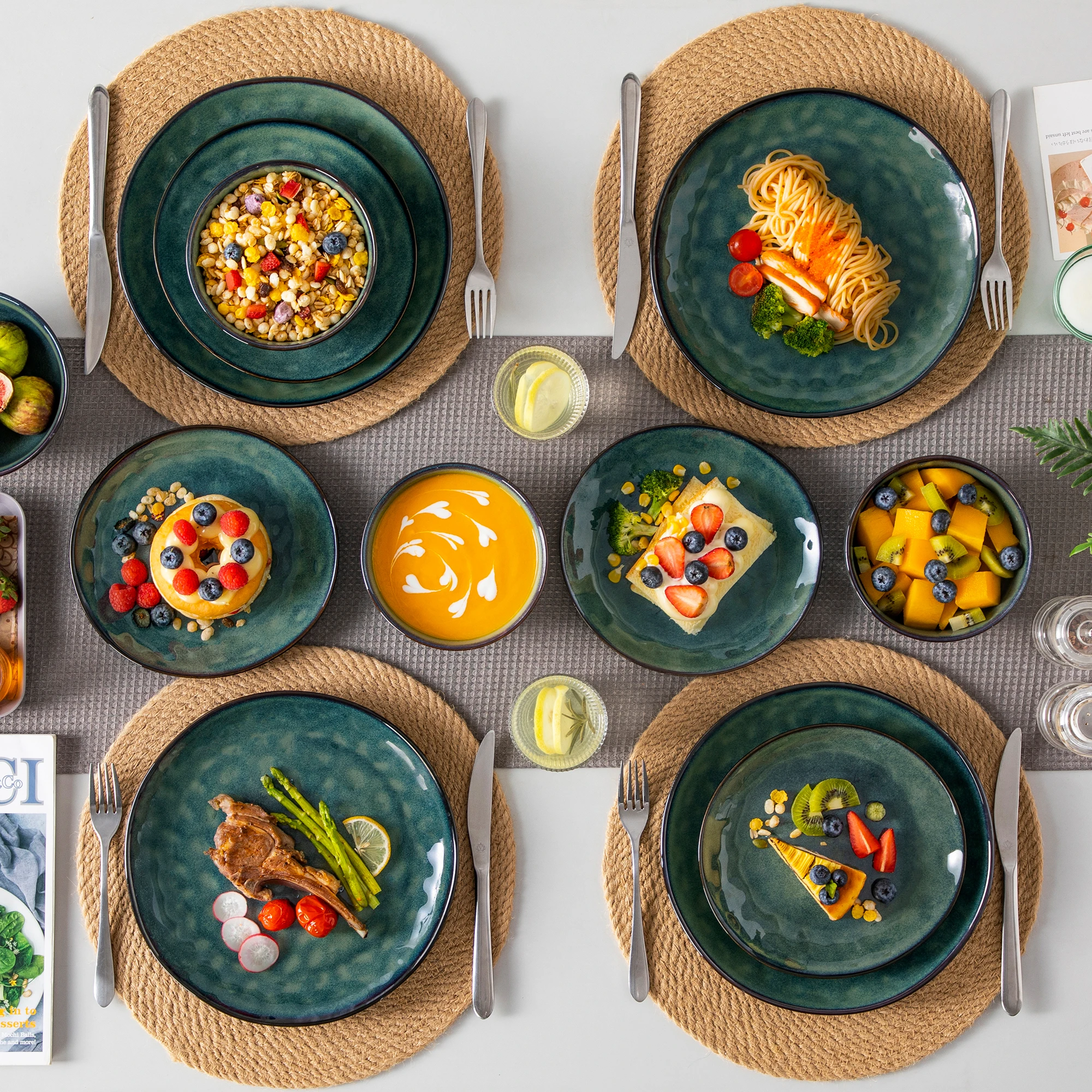 COMPLETE 12 PIECE SET – This 12-piece stoneware dinnerware set, designed to seat 4 people, includes 4 720mlereal bowls, 10.5-inch dinner plates, and 8.5-inch dessert plates.